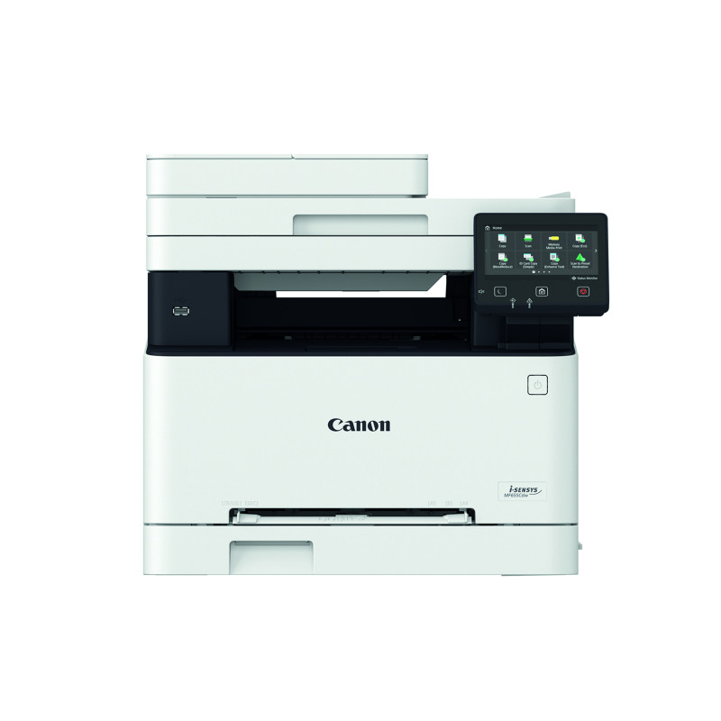 This Canon i-SENSYS MF655Cdw colour multifunctional A4 laser printer, copier and scanner. Printer, copier and scanner produces quality prints at 21 pages per minute. The warm up time is 13 seconds or less from power on, with first printout in 10.5 seconds or less. Print resolution is up to 1200 x 1200 dpi. Automatic double-sided printing. 45 PCL fonts. Copy resolution up to 600 x 600 dpi. Up to 999 multiple copies. Automatic 1-sided to 2-sided copying. Reduction/enlargement in 1% increments (25-400%). Colour scanner is a Platen, 2-sided ADF type, with optical scan resolution up to 600 x 600 dpi, 24 bit input and output, 256 greyscales, and compatibility: TWAIN, WIA, ICA. All controlled via 127mm LCD colour touch screen. Supplied with Black: 1,350 pages, C/M/Y: 680 pages starter cartridges.