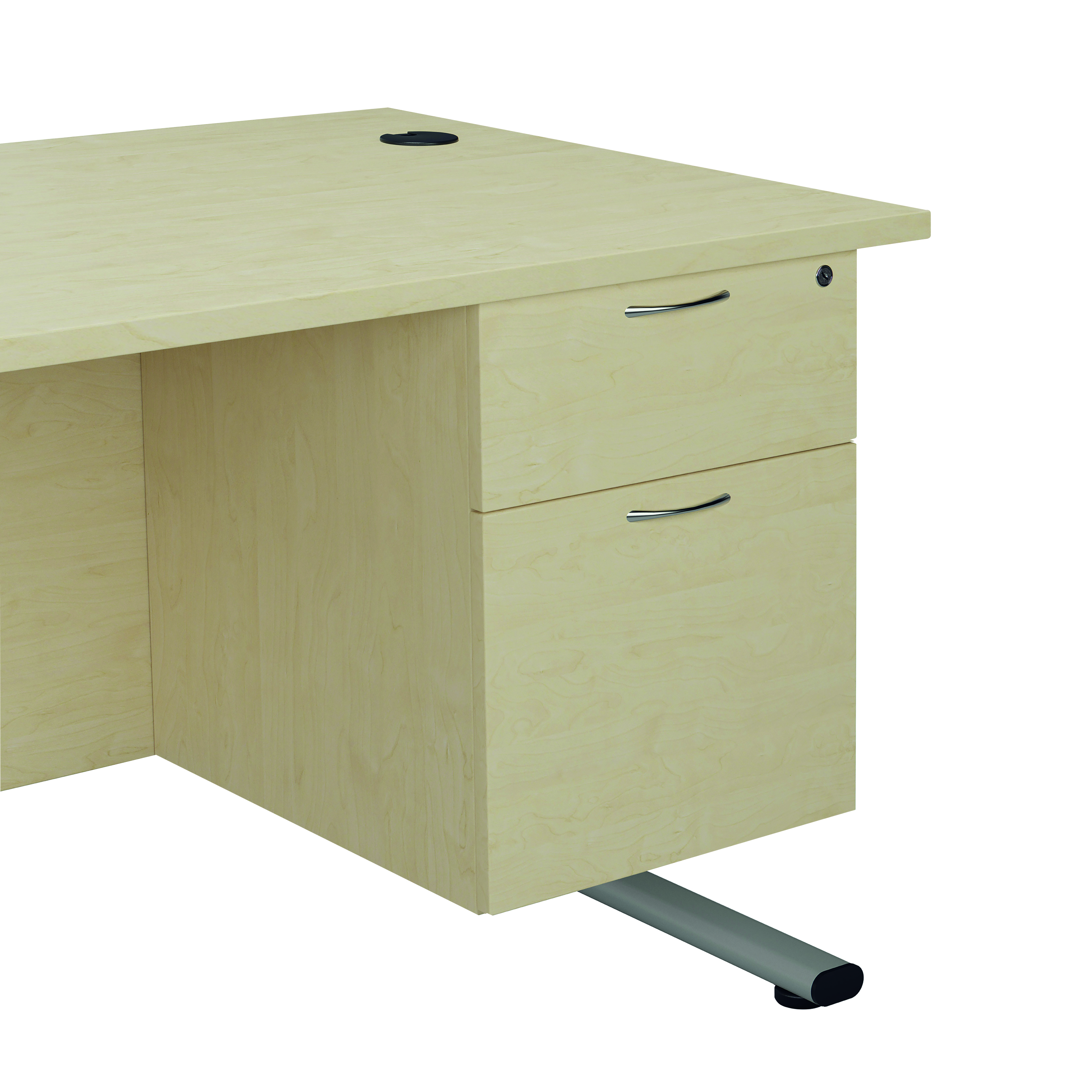 Finished in Maple, the Jemini fixed pedestal features 2 drawers including 1 box drawer and 1 foolscap size filing drawer. The box drawer will take A4 files. Measuring W400 x D500 x H495mm with a 25mm desktop, this Jemini fixed pedestal is designed for use with single upright desks, making an ideal storage solution.