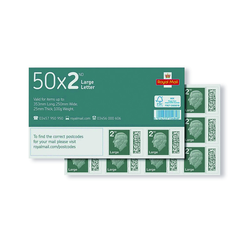 A must have for large letter or parcel posting, always be prepared with this sheet of 50 x Large Letter 2nd Class Postage Stamps, ideal for the home, office or to ensure you always have a stamp available when you need one. These Large 2nd class stamps can be used to send letters up to 100g.