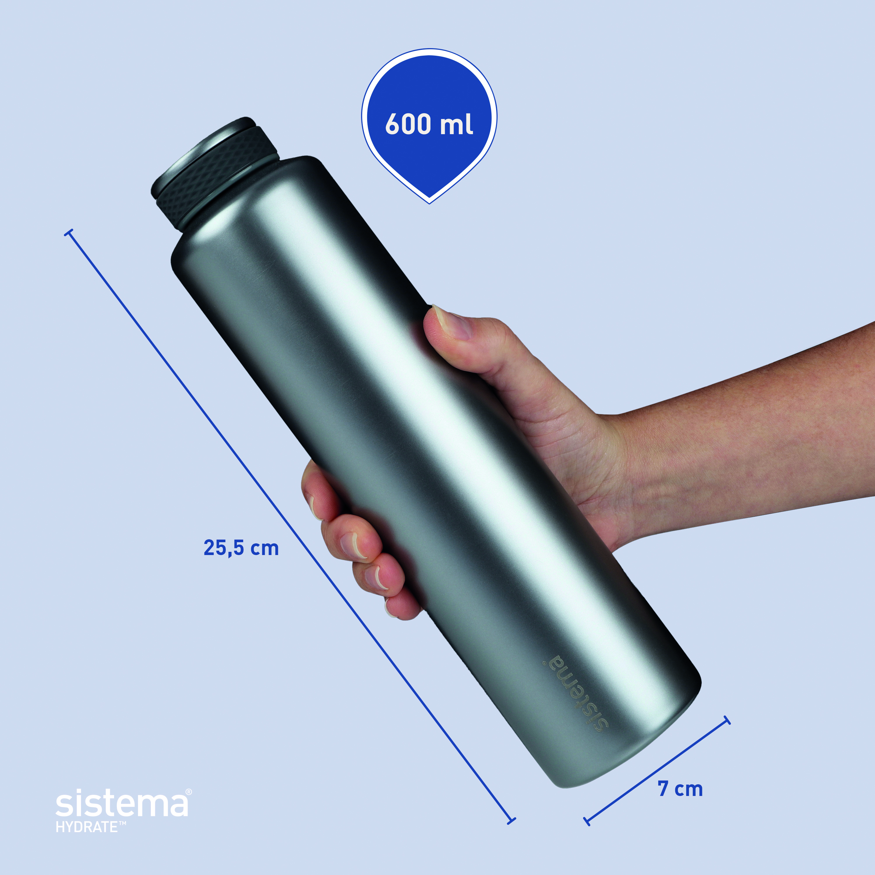 The Sistema Hydrate stainless steel bottle is perfect for school, work, sports and picnics to keep hydrated on the go. Simply fill the 600ml bottle and close the leak-proof screw-on lid. The stainless steel bottle has been designed with double wall vacuum insulation to encapsulate beverage temperatures for longer, keeping them hot up to 6 hours and cold up to 12 hours. Made from high quality stainless steel that will not rust over time.